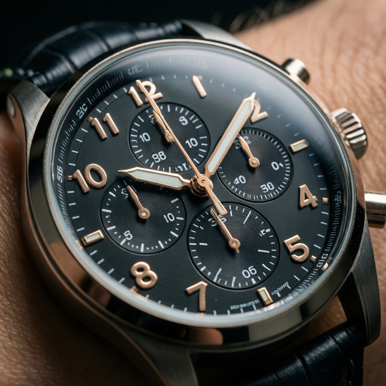 - Субциферблаты хронографа часто подписаны (MIN, HOUR) или имеют шкалы 30/60.