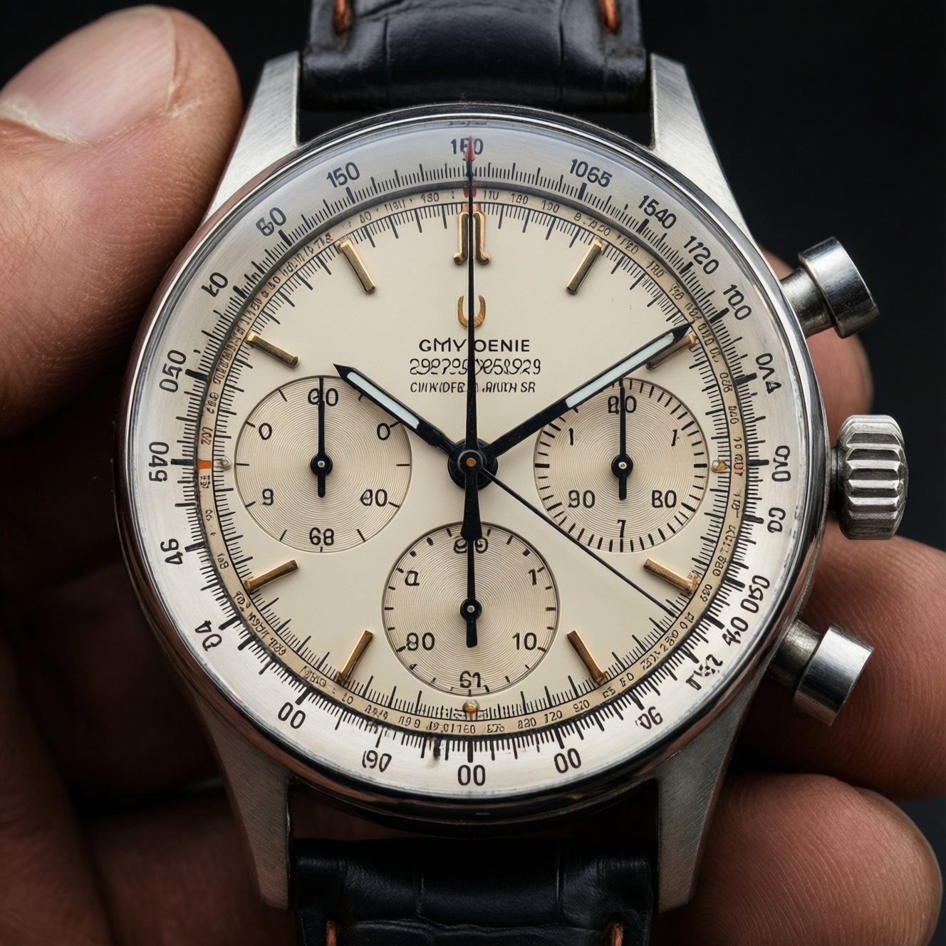 Найдите телеметрическую разметку: обычно это шкала с подписью telemeter/telemetre или с делениями расстояния по внешнему краю. Убедитесь, что центральная секундная стрелка запускается кнопкой (это секундная хронографа).