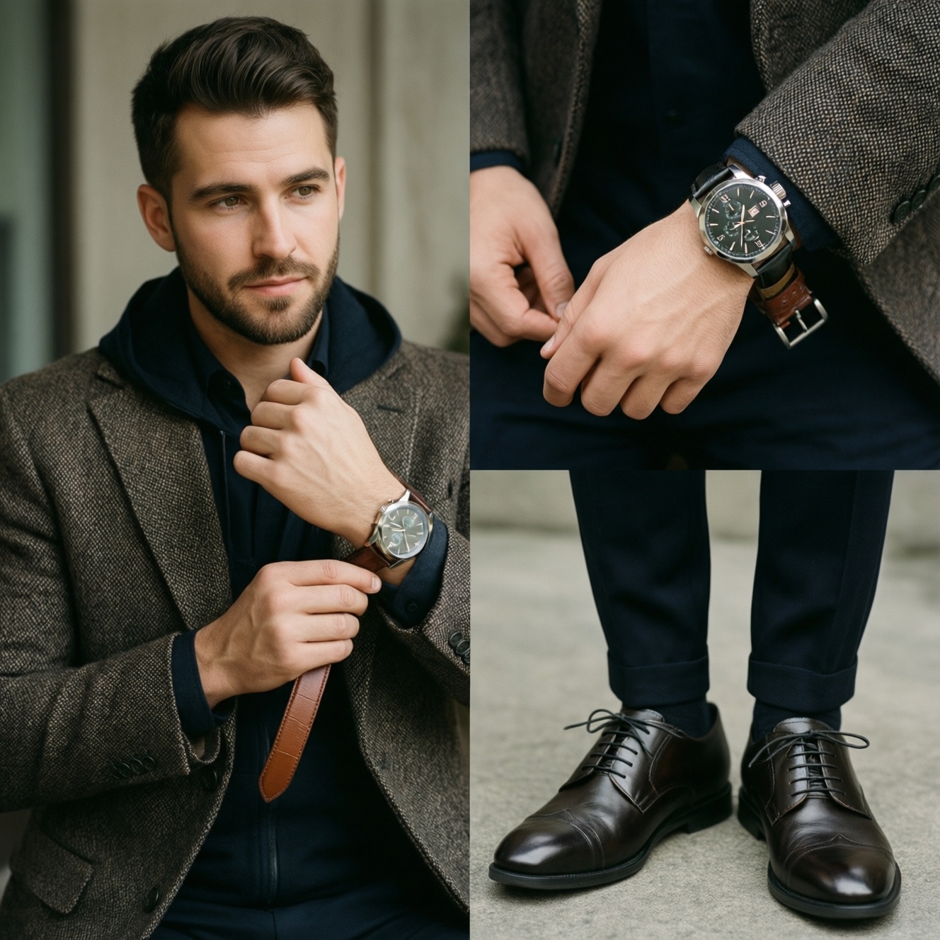 - Цветовая связка: циферблат + ремешок + обувь/ремень/фурнитура.
